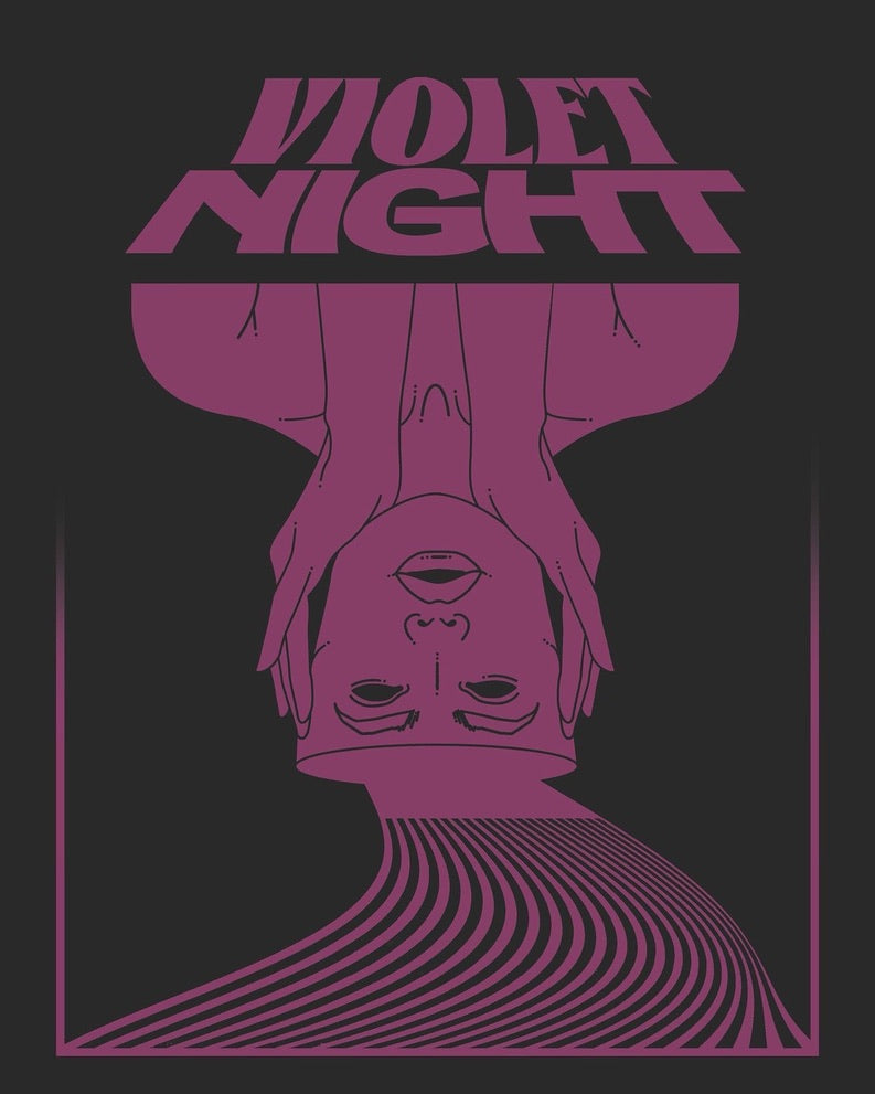 Comfy, stylish and as always this piece is limited. Gracing the front is our cleverly named friend “Headtrip” spilling themselves out. At a distance their silhouette resembles an hourglass. On the right arm the word VIOLET NIGHT spans its length vertically while ‘VIOLET NIGHT’ is placed horizontally between each descending letter. The left arm features the text '“H E A D T R I P” with the word ‘HEAD’ in solid dark raspberry, and TRIP with a dark raspberry outline and black filling the centre.